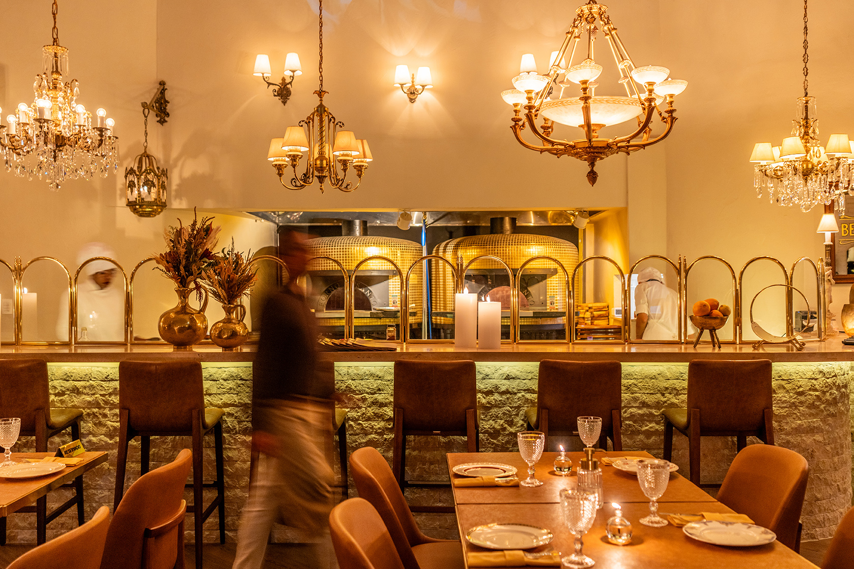 Outro ponto de atenção do projeto é o enorme balcão de travertino romano disposto de forma orgânica, que parte da entrada e vai até o salão principal para total interação das pessoas com as áreas de trabalho, seja no bar ou na pizzaria onde atrás de uma vitrine delicada e charmosa feita em arcos de latão e vidro recebem os dois fornos de pastilhas douradas.